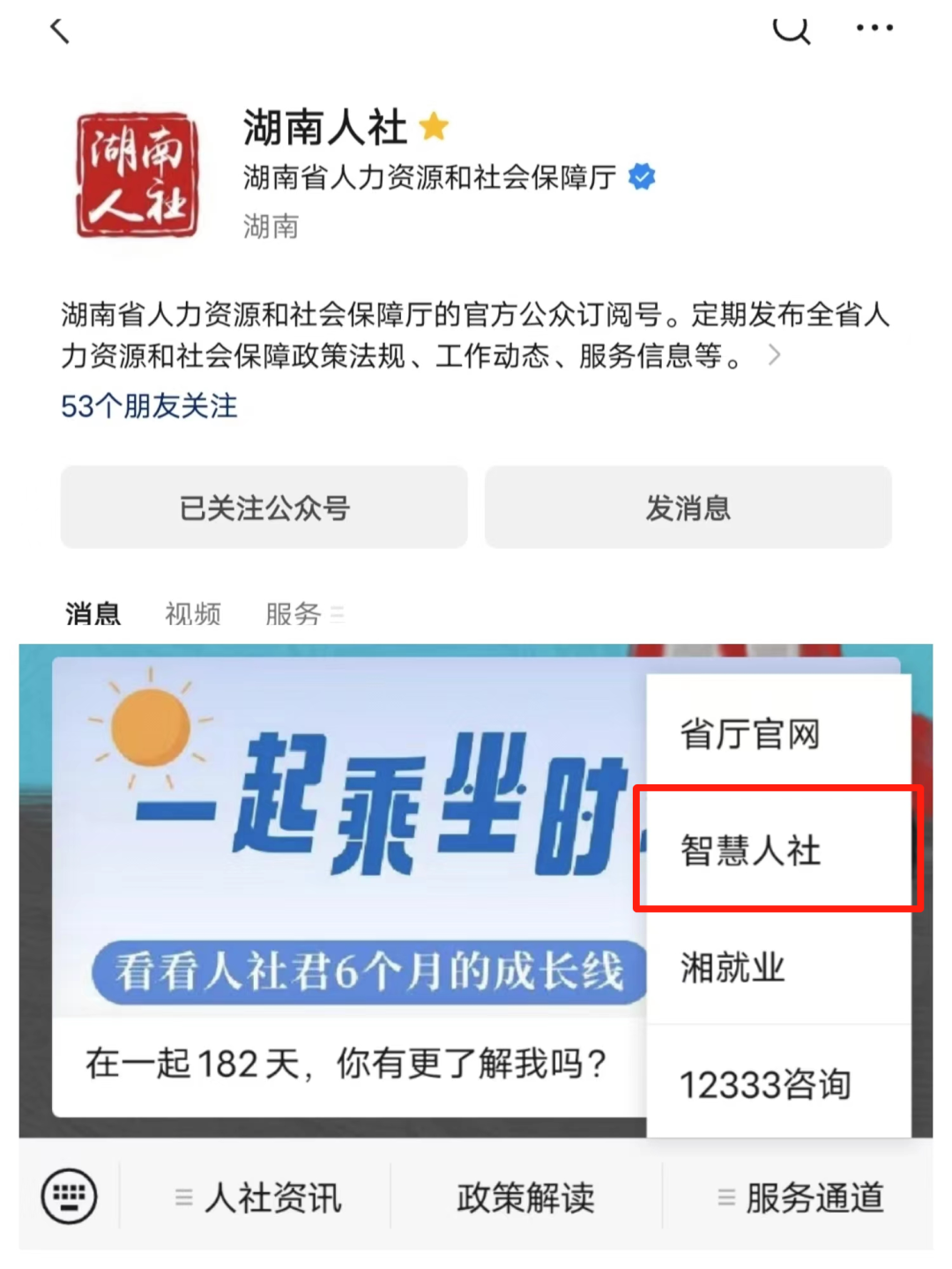 2、關注“湖南人社”“智慧人社”微信公眾號,點擊【服務通道】→【智慧人社】→【更多】→【社會保險-失業(yè)保險金申領】→【失業(yè)保險金申領】辦理;